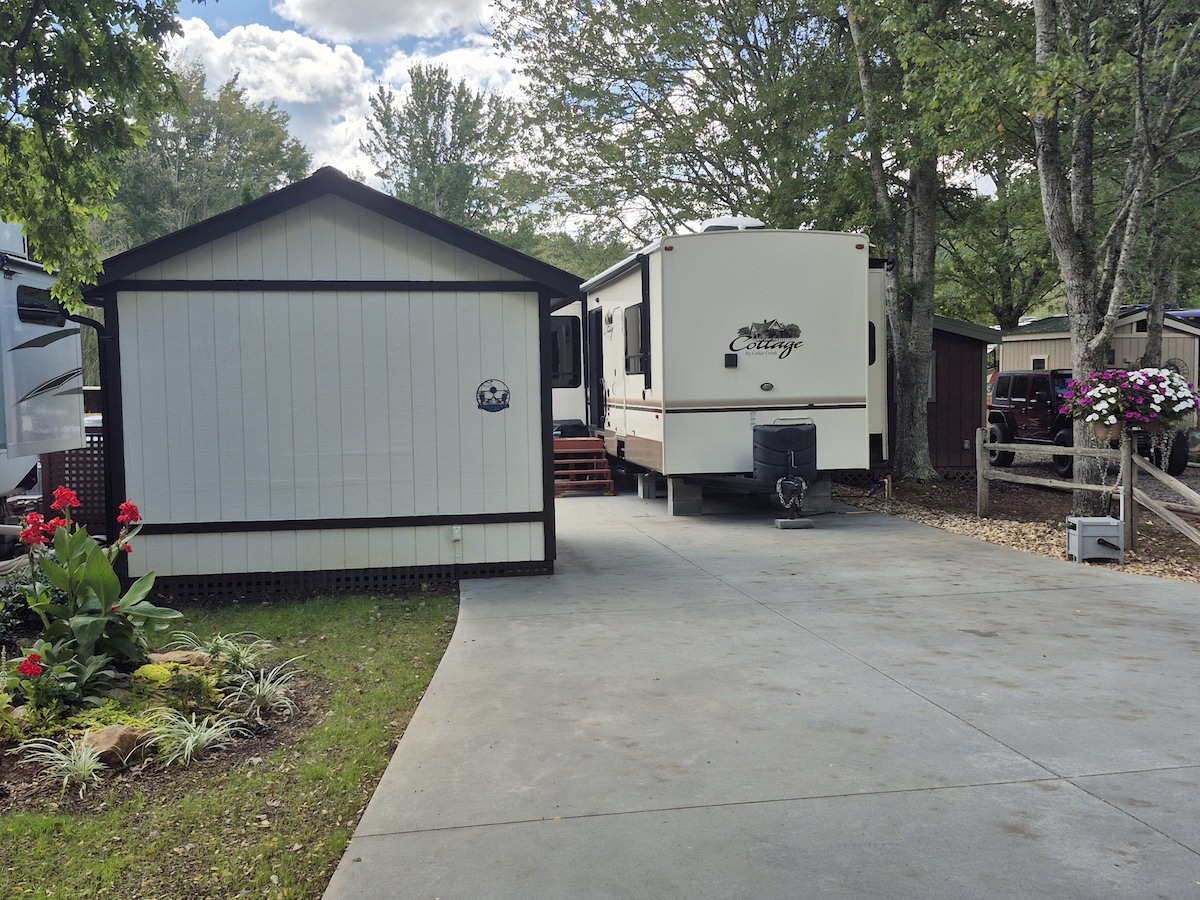 90 Natures Lane - Lot & RV - $135,000 Shaded, paved lot with 2016 Jayco Pinnacle Model 36FBTS and 10’x12’ insulated and finished shed. The shed has bead board paneling, ceiling fan, tile floor, metal roof, A/C and heat. RV has 1.5 baths, king bed, dual sinks in master bath, electric fireplace,